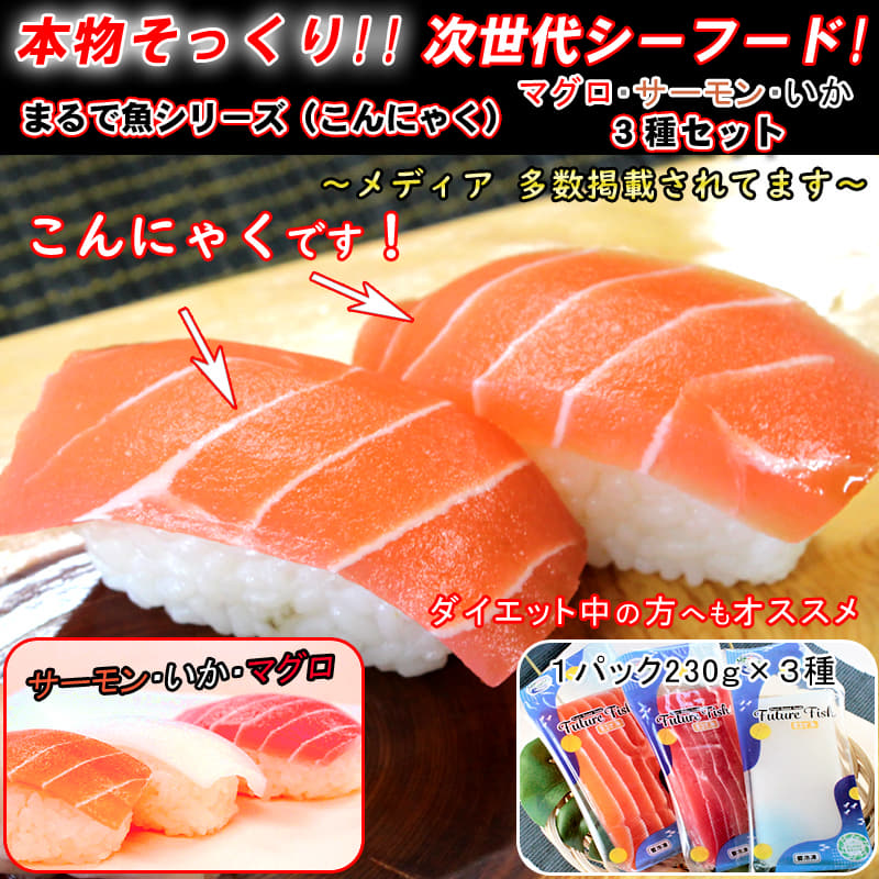 | 商品名 | まるで魚シリーズ(こんにゃく)マグロ・サーモン・いか 3種セット |